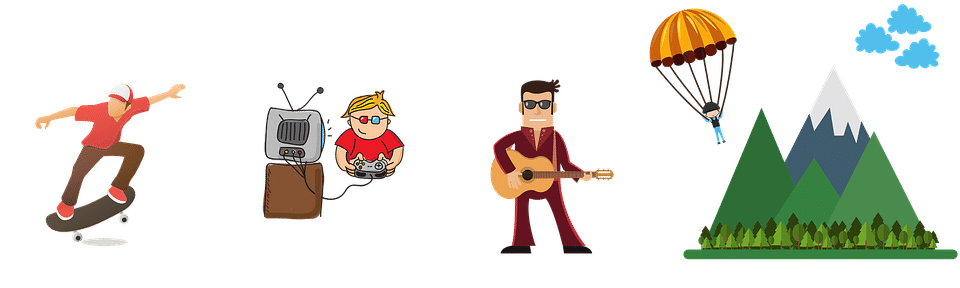 Já mám různé koníčky, například ježdění na skateboardu, videohry, kytara a skákání s padákem.