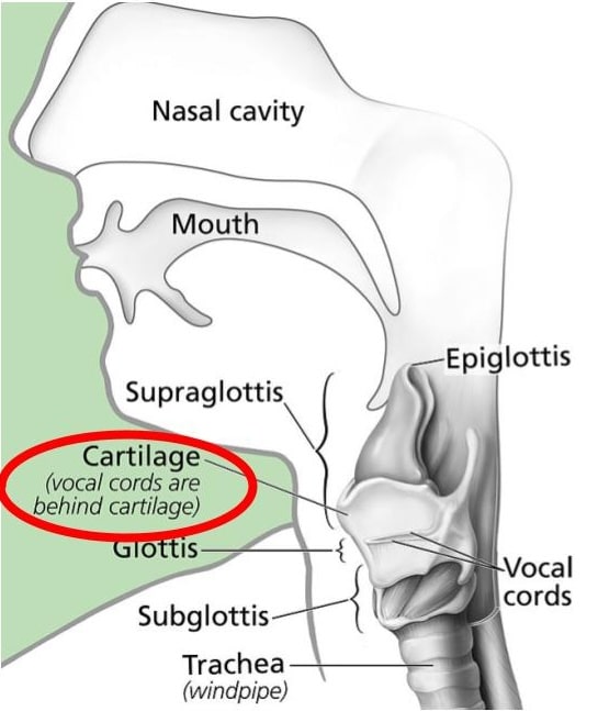 Consonants on the left are voiced and consonants on the right are voiceless. What does this mean? The easiest way to hear (and feel) the difference is by putting your fingers on your neck where your vocal cords are (see image on right).